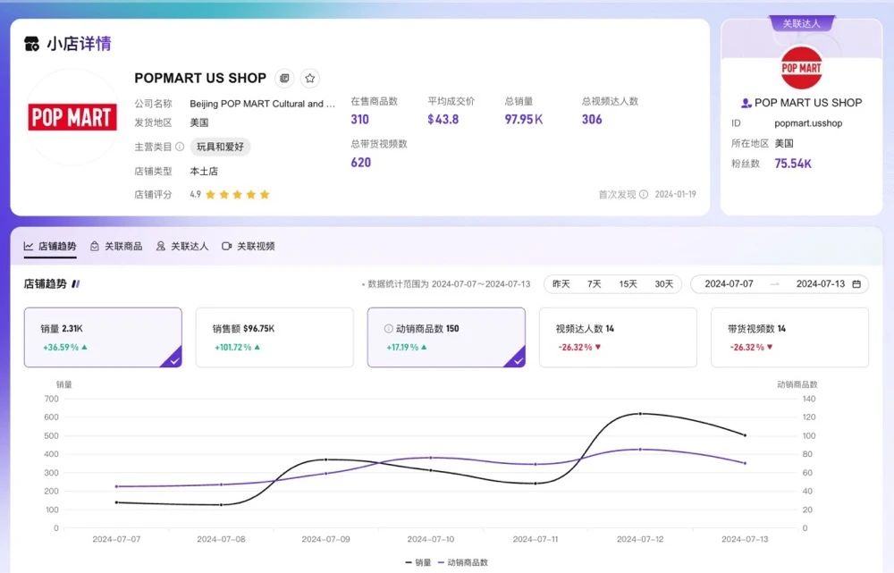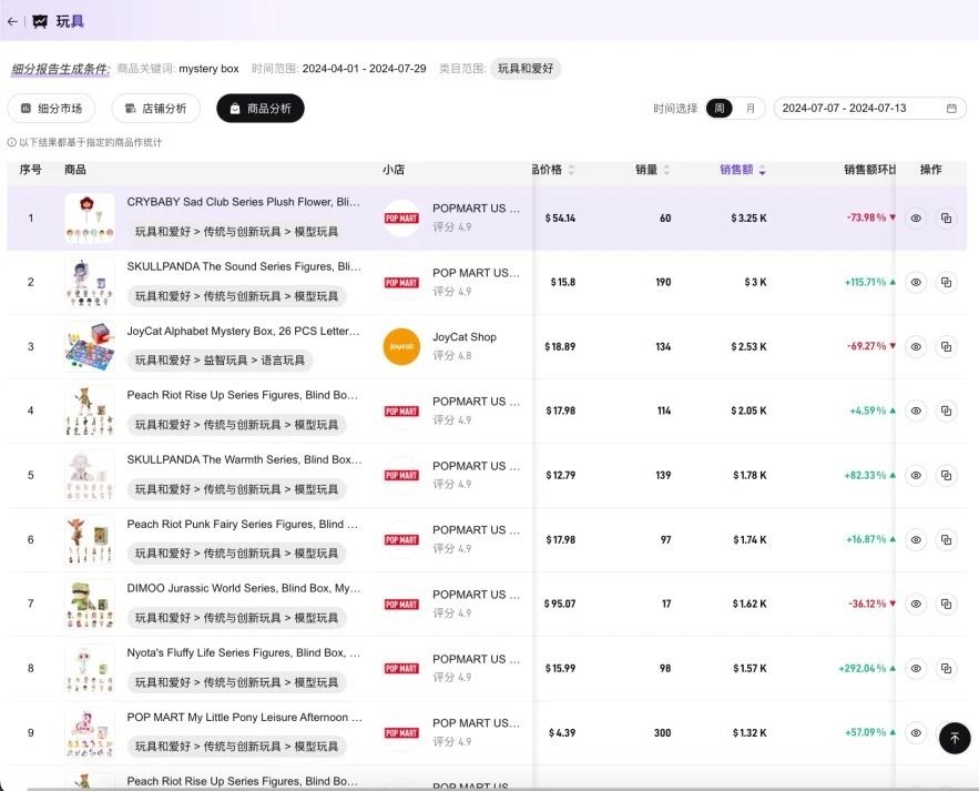 同时,泡泡玛特的两家本土店也迎来了销售高峰,展现了强大的市场号召力。POP MART USSHOP在大促当周(7/7-7/13)实现了1740件的销量,单周环比增长39.5%,总销售额为6万美金左右;而POPMART US SHOP单周实现了2310件的销量,单周环比增长36.59%,总销售额为9.7万美金左右。通过GlodaStory市场大盘洞察大促当周玩具赛道的数据,可以发现当周的玩具行业销售情况为237万美金,销量为13.4万件,周环比增长略微降低,市场份额也降低了24.86%。而泡泡玛特的销售增长也表明了大促活动对品牌的推广效果和对消费者的吸引力,以及美区玩具市场始终处于一个待开发状态,通过多平台对比的数据,新入场的商家也一定能找到蓝海商机,找到合适的切入点。