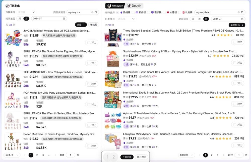 GlodaStory在三合一跨域数据创意选品的「亚马逊板块」中搜索关键词"Mystery box",经对比搜索结果发现,在亚马逊平台上“盲盒”类商品种类繁多,并且不局限于玩偶类的盲盒,还有卡片类、水晶类、时尚配饰类等等,这一结果反映了,在美区盲盒类玩具存在市场潜力,但目前TikTok美区这一赛道被泡泡马特主导着,实际存在大量的蓝海商机被激发。因此,商家可综合「市场大盘」、「创意选品」、「细分市场」三大板块的数据洞察玩具市场现状,对比多平台的商品数据,锁定核心关键词,获取更精准的销售和推广数据,打开美区市场新商机。