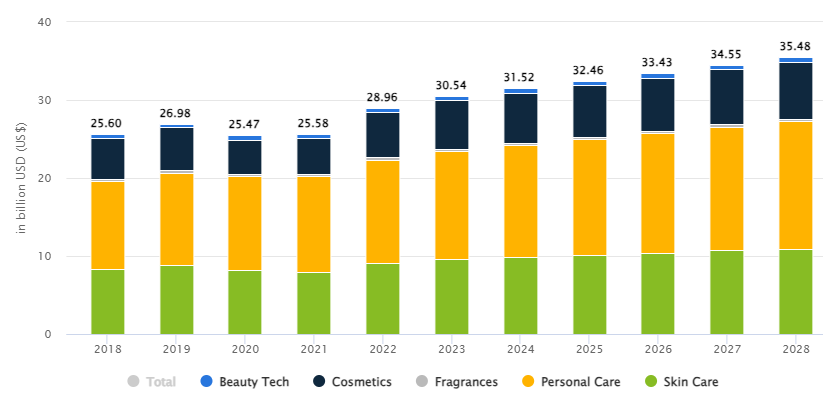 对于亚马逊来说,扩张美容业务显然是明智之举,因为印度美妆市场的潜力正加速爆发。 根据Statista的数据,印度美容个护市场预计到2028年将产生354.8亿美元的收入。另一机构IMARC Group也预测,2023年至2028年期间印度美容个护市场将保持6.45%的年复合增长率,市场规模有望达到380亿美元。