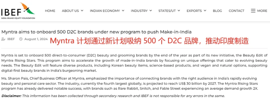 Myntra计划吸纳500个DTC品牌 图源:IBEF