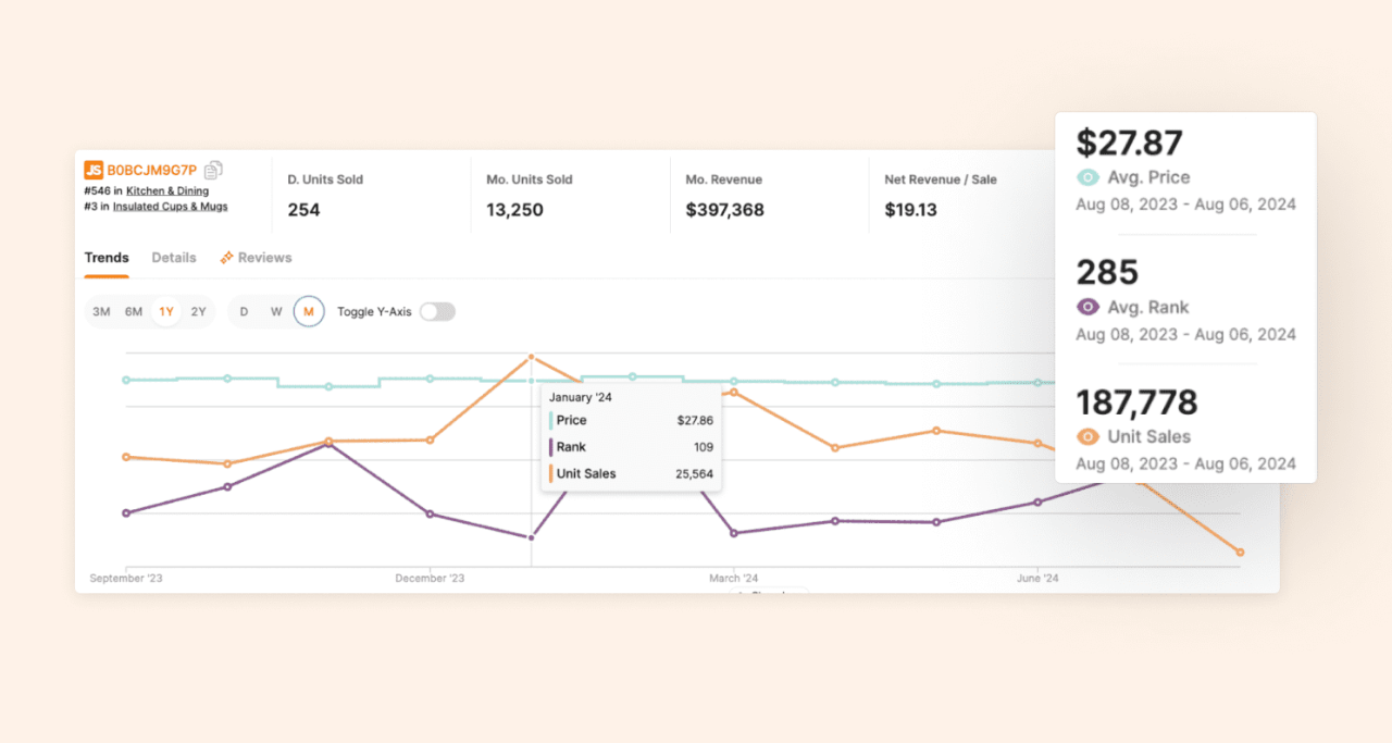 无独有偶,另一个因TikTok爆红而在亚马逊销量激增的案例是Meoky随行杯。在过去几年的水瓶热潮中,凭借众多TikTok创作者制作Meoky杯子视频的热度加持,在过去十二个月里,品牌亚马逊上的销量也出现显著增长。
