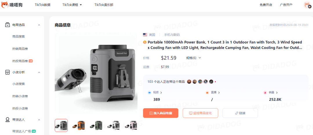 近期,嘀嗒狗观测到一款结合了手电筒和风扇的多功能充电宝月增长率高达1113%!