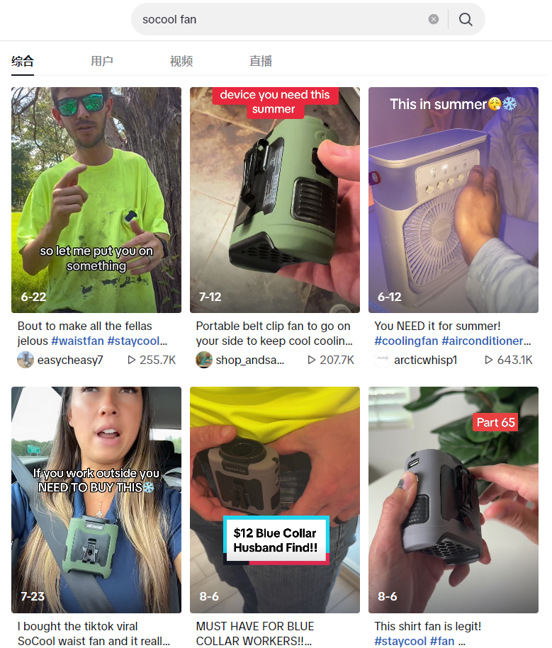 通过搜索商品品牌“SoCool Fan”可以看到相关产品的推广视频。TikTok上关于该产品的视频大多为使用者在户外测试这款产品的制冷效果。