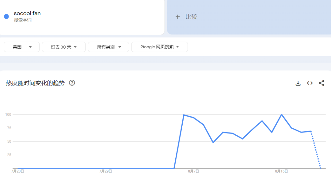 通过Google Trends我们可以了解到一定时期内,产品关键词在搜索引擎上的搜索热度和市场趋势。输入关键词“SoCool Fan”可以看到,近30天内,美国地区关于这款产品的搜索趋势和销售趋势重合度较为相似。但随着温度的降低,这款产品的热度仍未消减,说明其作为充电宝来看,也是十分出色的产品。
