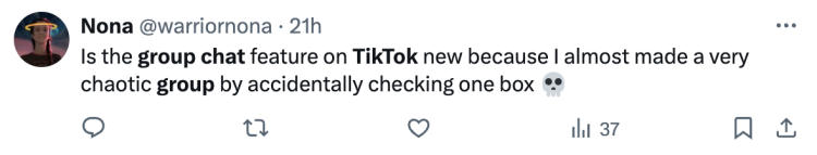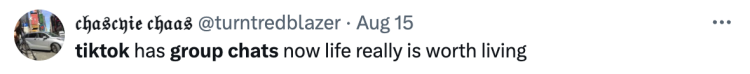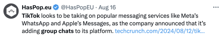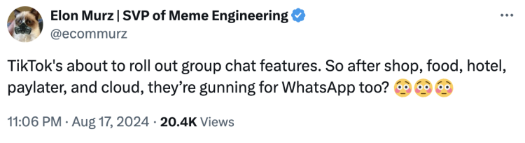 “TikTok 即将推出群聊功能。所以在推出购物、食品、酒店、先买后付和云服务之后,他们还要对 WhatsApp 下手了吗?”