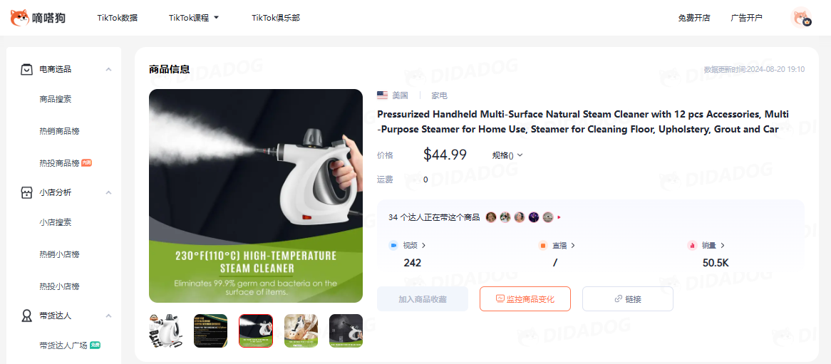 视频同款在TikTok Shop的价格为44.99美刀。嘀嗒狗数据显示,该商品在3月2日上线TikTok Shop,最高一日卖出2500单。这对于清洁器来说,是一个十分惊人的数据。 该品本月目前已累计售出近1.6万单。该产品所属小店HattyroomDirect以家用好物为主,包括一系列的清洁用具和榨汁机等。入驻TikTok短短数月,销售额已达到190万美刀。