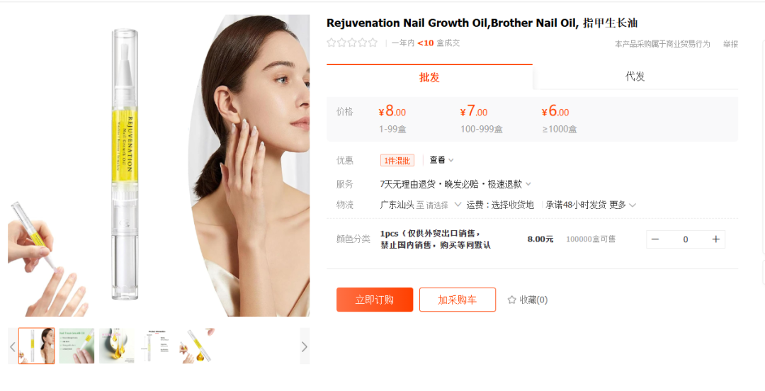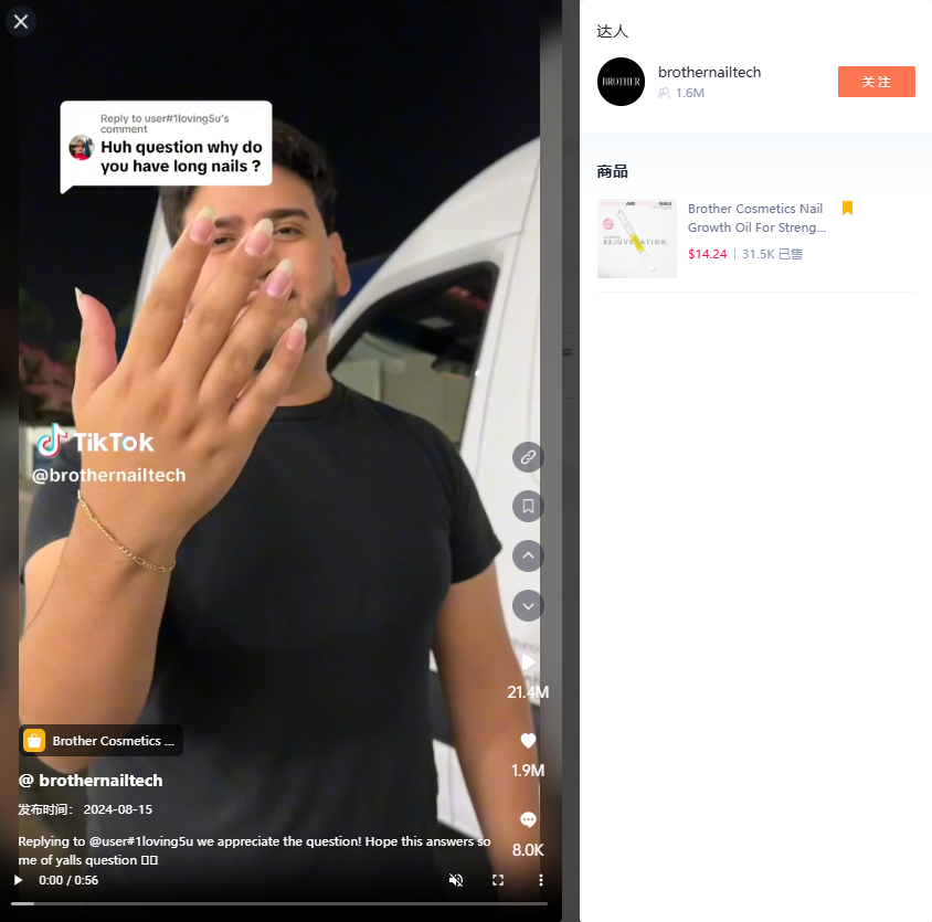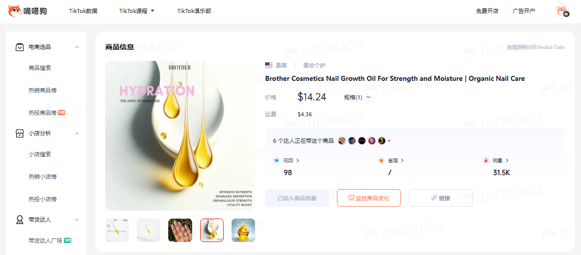 视频同款在TikTok Shop的价格为14.24美刀+4.36美刀运费,嘀嗒狗数据显示,该商品在4月9日上线TikTok Shop,最近几日有过连续爆单记录,最高一日卖出6400单! 小店Brother Cosmetics于4月9日入驻TikTok,主营产品便是该款指甲生长油,目前已拥有42.4万美金的销售额。