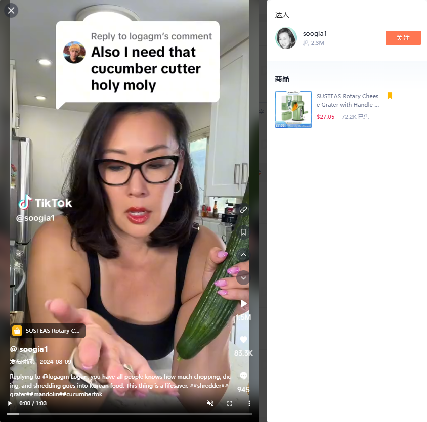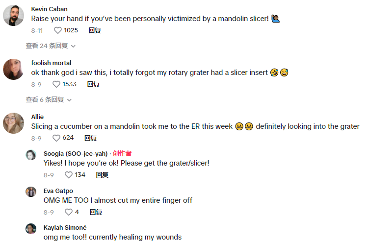 [mcv_dplayer source="https://img.tkfff.com/2024/08/8月23日2.mp4" width="100%" height="500"] @soogia1的视频在8.9发布,嘀嗒狗后台观察到这条视频目前有150万的播放量和8.3万点赞。视频中我们可以看到在这款刨丝器的帮助下,博主很轻松地就将一根黄瓜变成了一碗黄瓜片,同时她也向我们展示了其他的各种各样的辅助刀片,很难想象有了它做饭会有多快乐! 这款产品很好地拯救了每一个常年下厨的人的手指,大家甚至在评论区自发举起手来,证明自己也曾经被其他工具伤害过手指。有了它,再也不用担心手上全是岁月的伤口了!