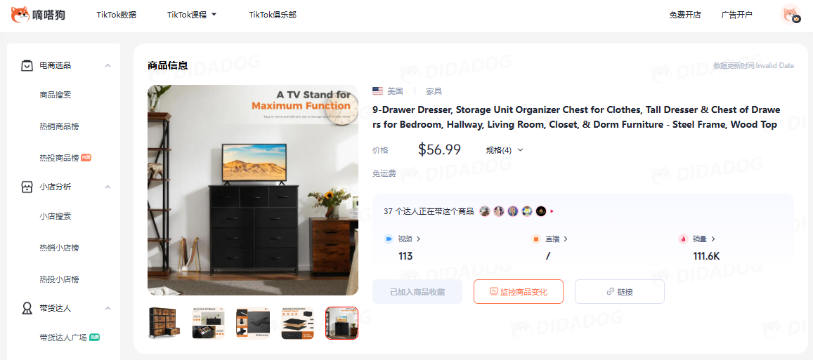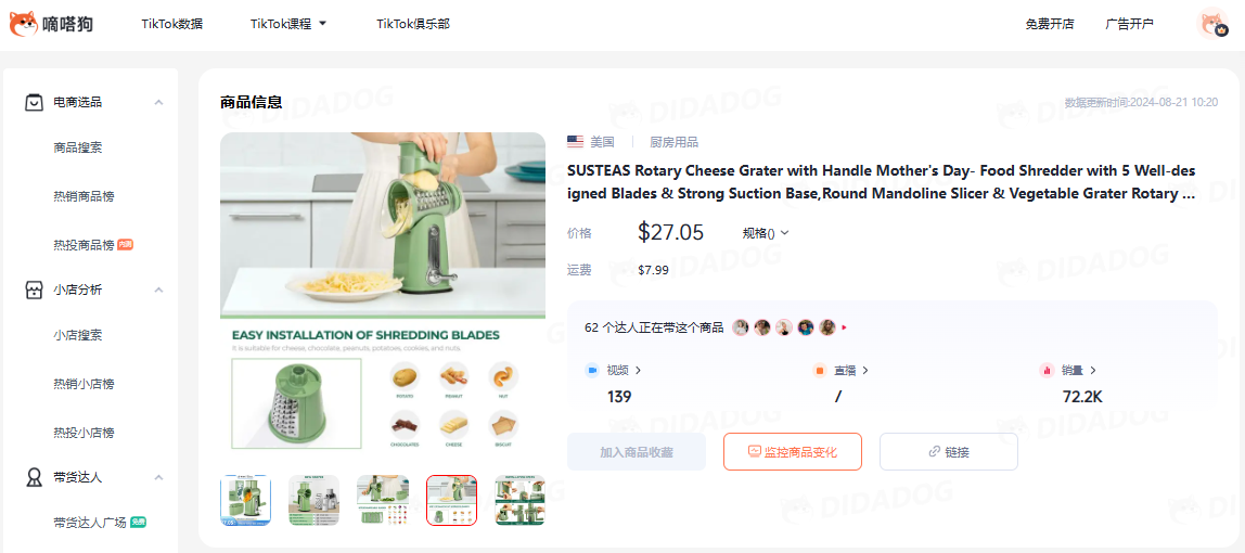 视频同款在TikTok Shop的价格为27.05美刀+7.99美刀运费,嘀嗒狗数据显示,该商品在1月23日上线TikTok Shop,近30天内日均出货量达2500件,8.2日出货3000多件。 所属小店SUMETAS的主要产品是各种各样的实用家具,包括茶壶,菜刀,电动烧烤盘等等。从23年8月入驻TikTok,目前该小店销售额已达到310万美刀。