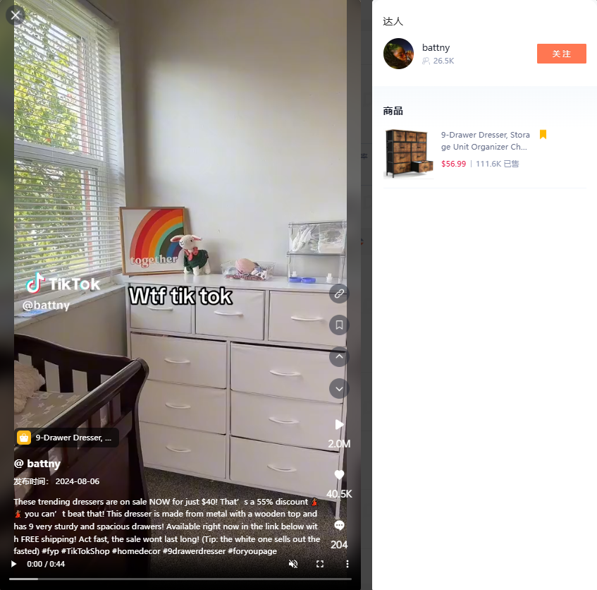 [mcv_dplayer source="https://img.tkfff.com/2024/08/8月23日3.mp4" width="100%" height="500"] @battny的视频在8.6发布,嘀嗒狗后台观察到这条视频目前有200万播放量和4.05万点赞。收容类家具一直是备受欢迎的赛道,因此在博主的细致展示下,产品收容和颜值的主要卖点一览无余! 评论区的用户纷纷称赞这款梳妆台的容量,称这是一款收容炸弹!一下子就把各种杂物炸没了!同时也有很多人喜欢它的颜色和质量,表示这个质量真的很难被替代。