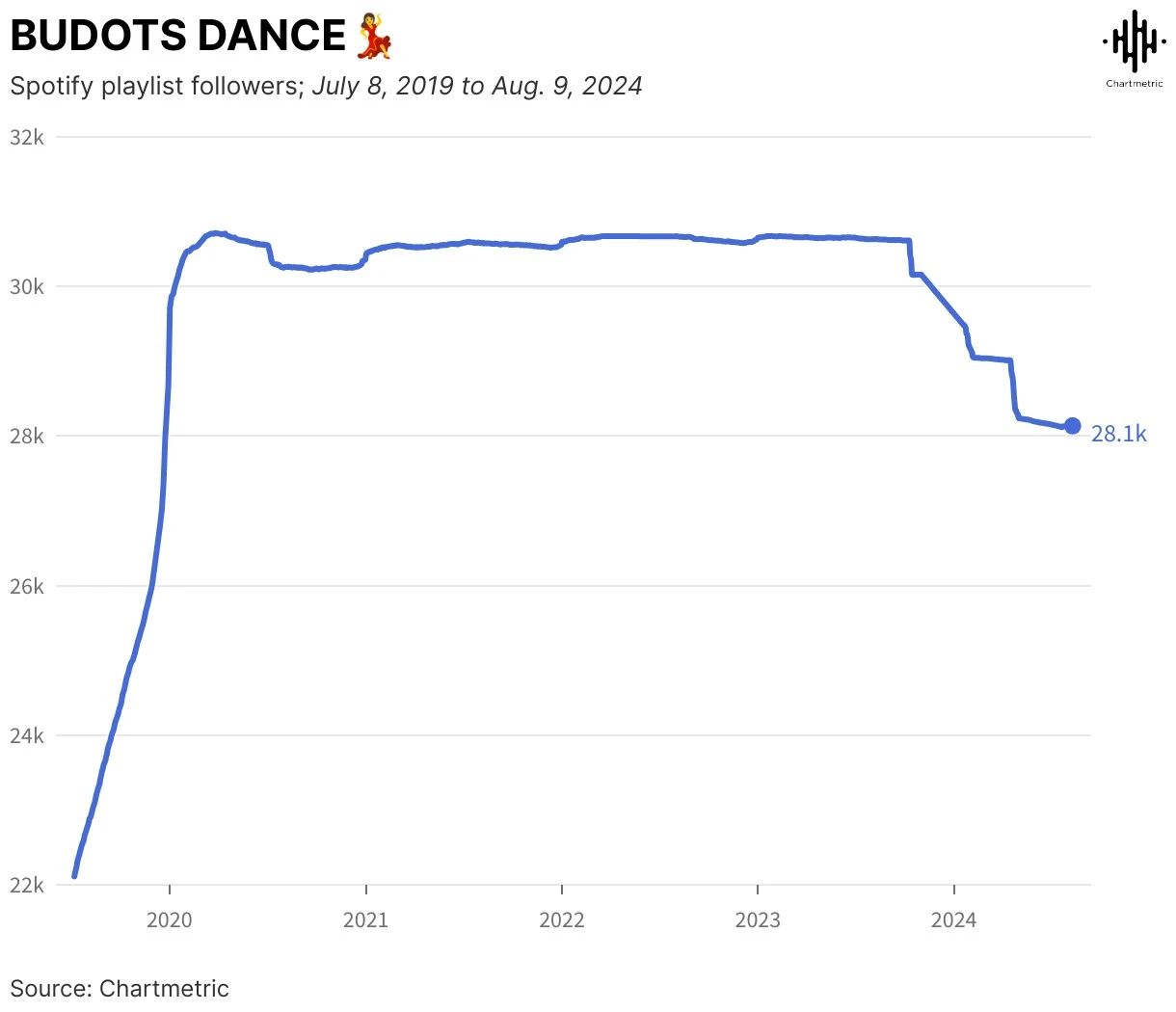 自2018年起,Spotify上的播放列表“BUDOTS DANCE”便开始陆续收录了97首Budots风格音乐作品,至今已经吸引了超过2.8万用户的关注。从下图可以看出,在2019年到2020年期间,这个播放列表的关注者数量急剧增加,从大约2.2万人上升到超过3万人。
