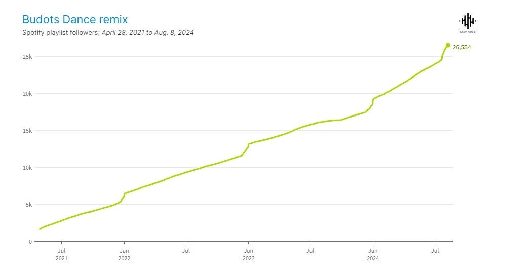 此外,越来越多的Budots播放列表也紧随潮流,出现在Spotify上。如播放列表“ Budots Dance Remix ”的关注量在七月底大幅度增加。