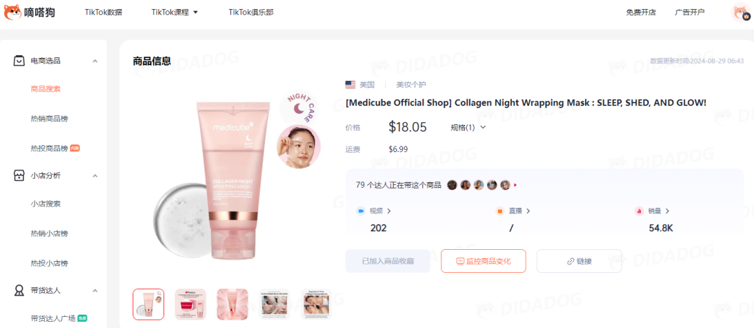 视频同款在TikTok Shop的价格为11.39美金+5.99美金运费,嘀嗒狗数据显示,该商品在8月6日才上线TikTok Shop。