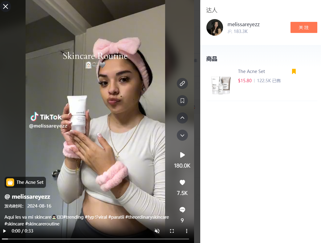 @melissareyezz的视频在8.16发布,嘀嗒狗后台观察到这条视频目前有近20万的播放量。视频中的博主先展示了自己如何使用这款产品,随后又向观众介绍了这款产品的特色。