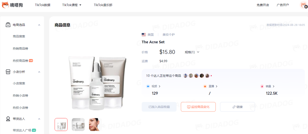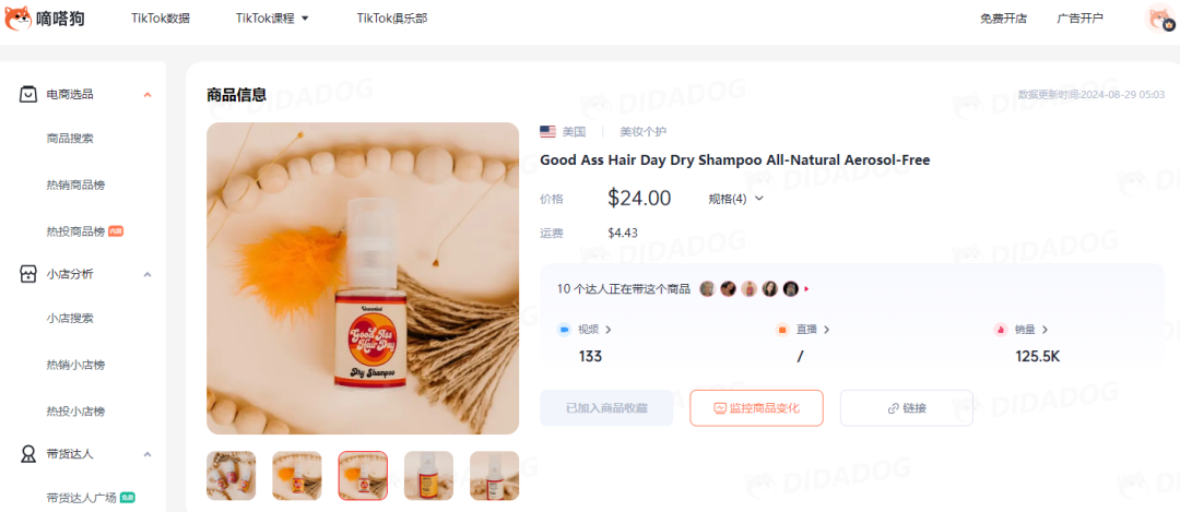 嘀嗒狗数据监测到有几款产品在TikTok Shop卖出高销量。干发喷雾、蓝牙耳机、水杨酸祛痘液等产品获得网友青睐。