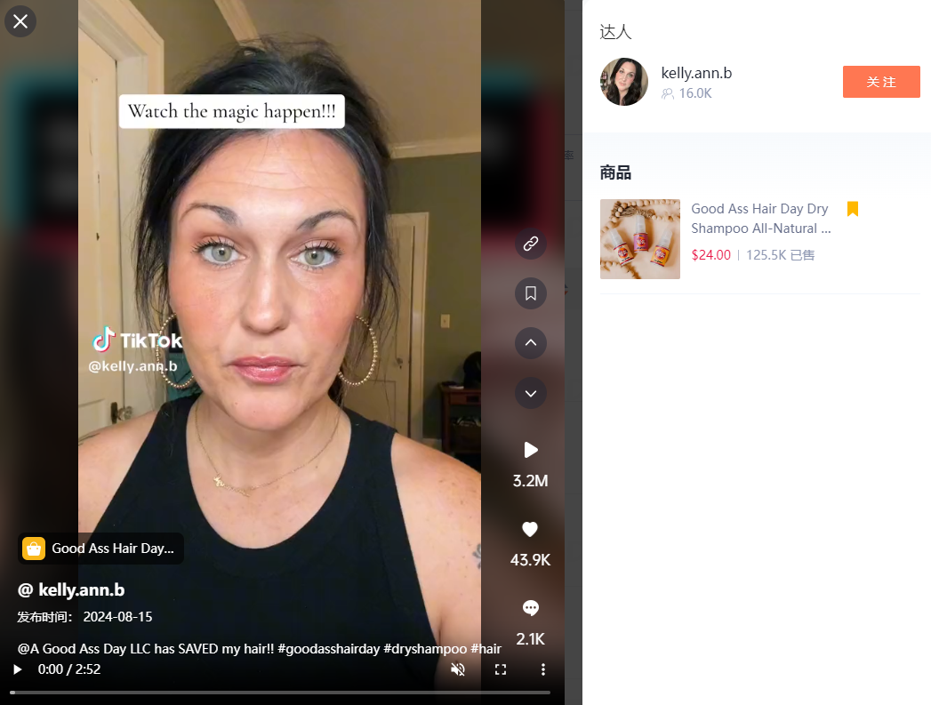 @kelly.ann.b的视频在8.15发布,嘀嗒狗后台观察到这条视频目前有超320万的播放量和近5万赞。视频中的博主用自己的头发展示了如何使用这款干发喷雾,并且展示出了前后对比。