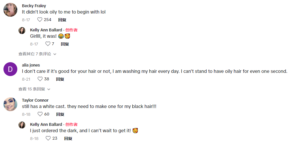 评论区的观众都分享了自己对于油头的处理方法,并且对这款产品有极强的购买欲望。