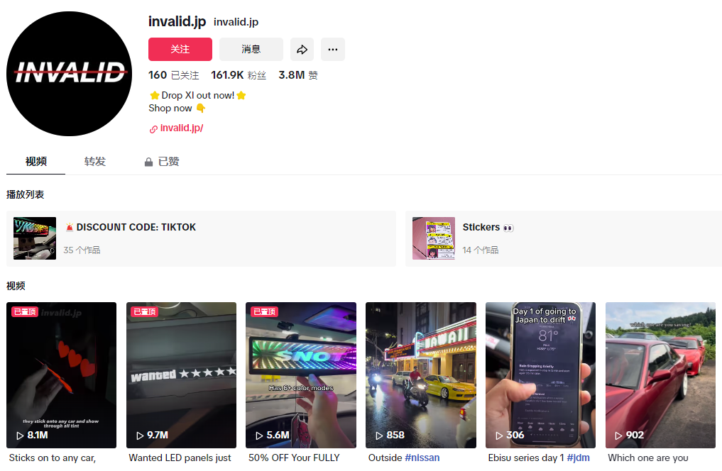 在TikTok上,@invalid.jp拥有16.19万粉丝,从2022年8月开始,在账号主页内发布了各种关于汽车发光装饰效果视频,播放数据都还不错。 invalid.jp作为新兴的汽车装饰配件品牌,该品牌的创始人Jayson Siu是一个年仅21岁的少年,在家庭的影响下Jayson Siu十分喜欢DIY改装汽车,早在其高中时期就开始关注到汽车装饰领域。 Jayson Siu凭借精湛的汽车贴膜手艺获得许多同龄人认可,其在Instagram洞察到“LED背光后视镜”炫酷与DIY创意贴纸结合起来,个性化LED汽车贴纸那一定很有趣。