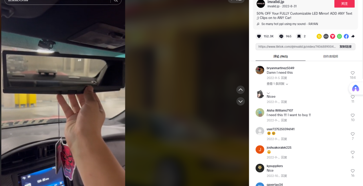 于是他便研究起创意LED定制汽车贴纸与专属后视镜,而真正让他爆火的是,来源于2022年8月分享的LED汽车后视镜,看似平平无奇的镜子,打开按钮,镜子竟能出现炫酷的灯光和独特的字母标识,瞬间提升了驾驶氛围。该视频发布后获得了560万次播放以及超过15万网友点赞喜欢。 从评论区中发现,这款LED镜子深受汽车改装爱好者青睐,不少网友直言需要一个,并表达要立即购买。短短14秒的视频为@invalid.jp吸粉无数,带动这款LED定制汽车镜畅销,甚至让Jayson Siu去打印店疯狂打印标签。