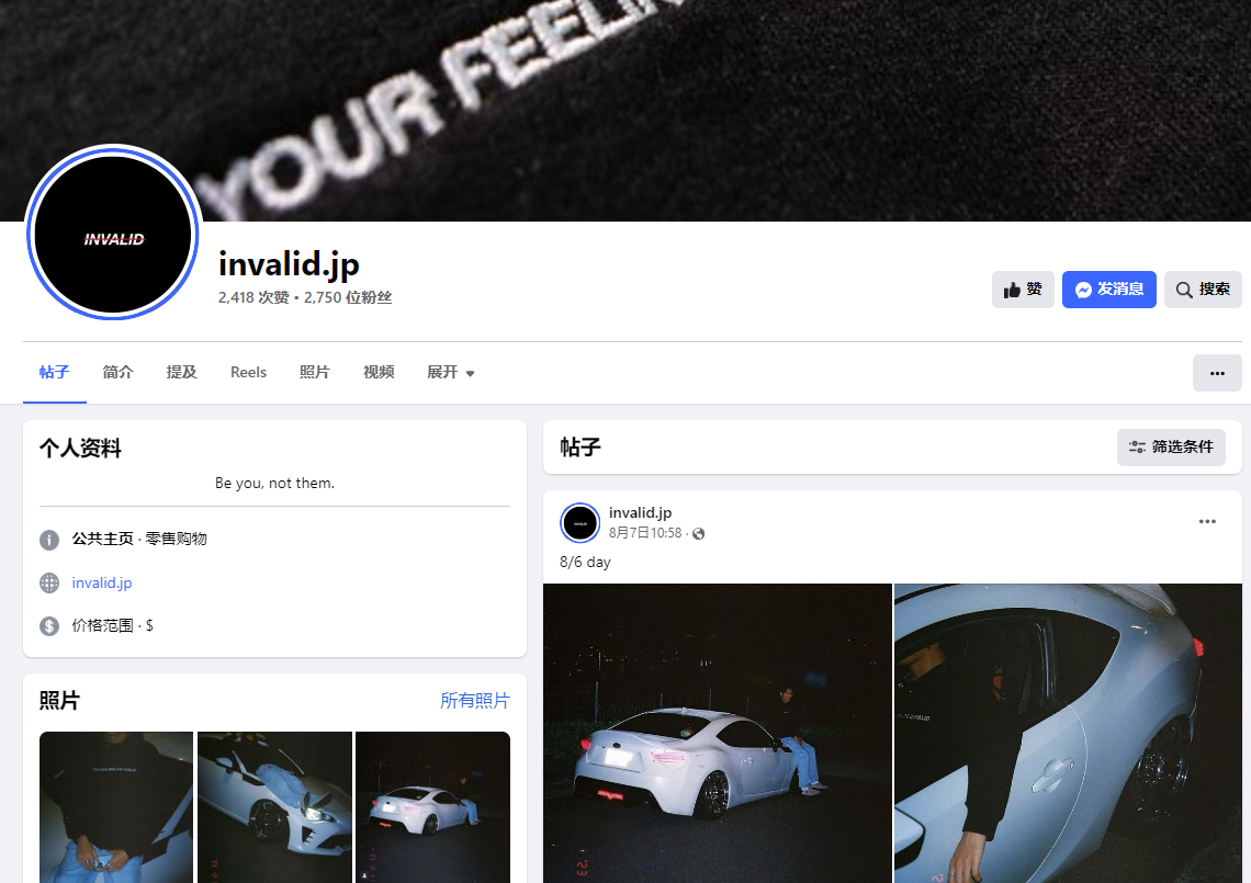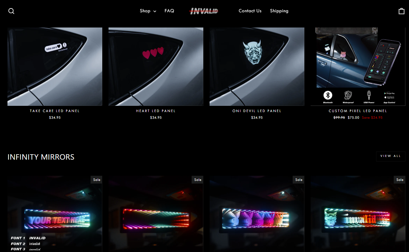 invalid.jp作为专注于汽车装饰配件产品的品牌,更注重于呈现视觉效果。以Facebook、TikTok平台为例,invalid.jp通过拍摄清晰的产品多场景图片与视频,展现发光贴纸对于汽车的装饰作用与氛围感,完整呈现产品效果,有利于扩大曝光,为独立站吸引更多流量与用户。 进入invalid.jp品牌独立站,黑色主题网站与简约大气的格调设计,十分符合受众群体的审美,而黑色的主题背景,恰好凸显汽车发光装饰贴纸的产品效果。