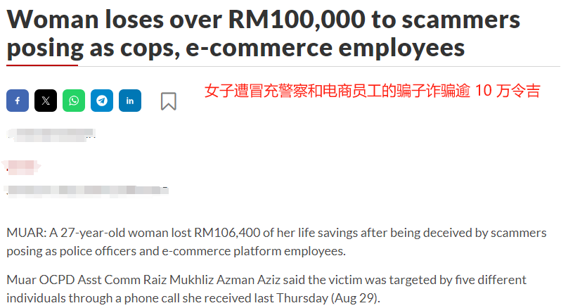 这年头,骗局真是层出不穷。不管是买家还是卖家,都有可能成为诈骗分子的目标。 近日,马来西亚警方接到了一名电商卖家的报案,该卖家称自己被冒充警方和电商平台员工的骗子诈骗,损失了10.64万令吉(约合人民币17.3万元)。