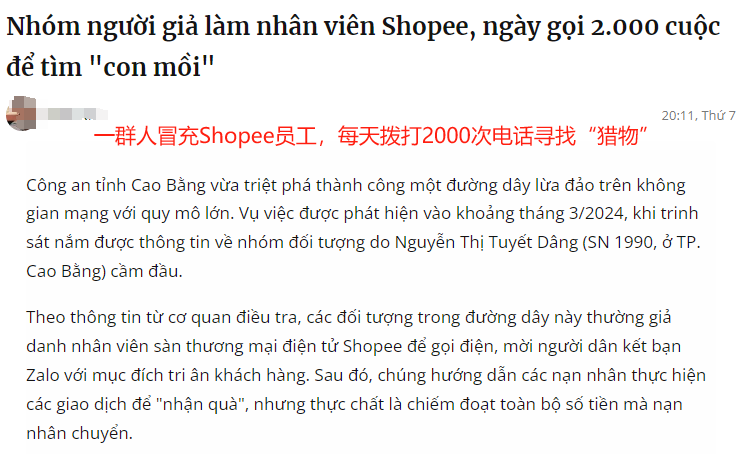 之后在5月,越南警方又成功捣毁了一批利用假冒电商平台进行网络诈骗的犯罪团伙。具体来讲,犯罪团伙在今年3月份经常冒充Shopee的员工打电话给顾客,邀请他们在Zalo(越南社交聊天软件)上加好友,回馈给顾客一些“礼物”,在顾客照指示操作后钱就不翼而飞了。