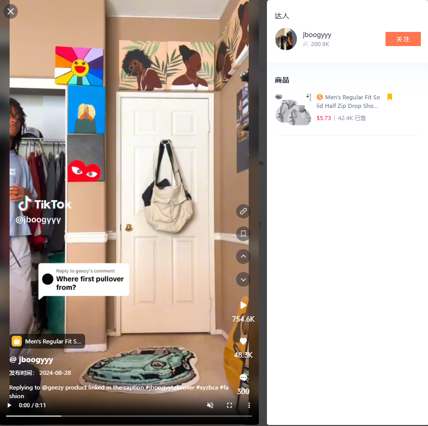 [mcv_dplayer source="https://img.tkfff.com/2024/09/9月6日-1.mp4" width="100%" height="500"] @jboogy的视频发布于8月28日,嘀嗒狗后台观察到该视频目前的播放量达到了75.4万,4.8万点赞。在视频中,博主向我们展示了这款连帽衫的舒适百搭。可以看到虽然博主的穿搭颜色十分鲜艳,但这件连帽衫还是做到了很好的搭配。 可以看到,大家纷纷表示这件连帽衫穿起来非常的潮,是现在爆火的单品。甚至在它的带动下,其他的几件搭配单品都显得十分时髦。