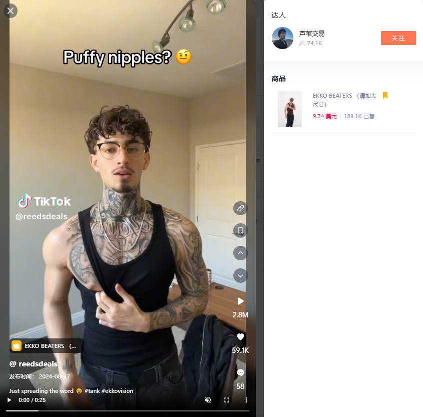 [mcv_dplayer source="https://img.tkfff.com/2024/09/9月6日-11.mp4" width="100%" height="500"] @reedsdeals的视频发布于8月17日,嘀嗒狗后台观察到该视频目前的播放量达到了280万,5.9万点赞。在视频中,博主的好身材在这款紧身背心的勾勒下显得非常的帅气精干,充满了男性魅力。 大家纷纷被博主的展示所吸引,甚至有的人直接表示了对博主穿上这款背心之后的心动,有的用户表示:天啊兄弟,太酷了,我一时不知道自己是异性恋还是什么!