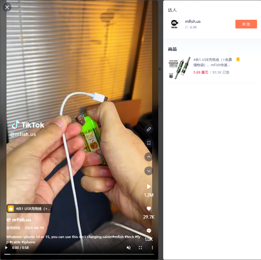 通过嘀嗒狗数据显示,视频同款在TikTok Shop的价格为5.96美金,该商品在7月10日上线TikTok Shop,本月已经售出6.1万单,在8.17单日售出3700单,且连续多天销量超3000单。 所属店铺mfish tech inc在TikTok Shop的销售额达到120万美金。店铺售卖的产品总销量超过10.4万单。