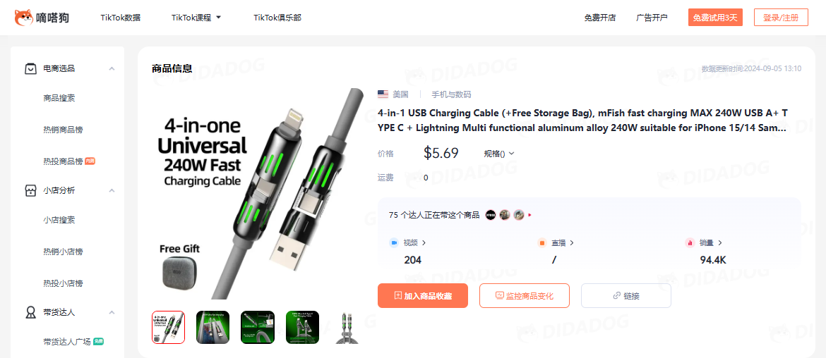 嘀嗒狗数据监测到有几款产品在TikTok Shop卖出高销量,男士连帽衫,地毯清新剂,USB充电线等产品获得网友青睐。