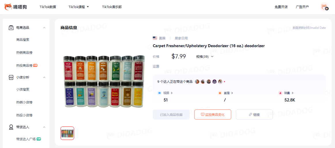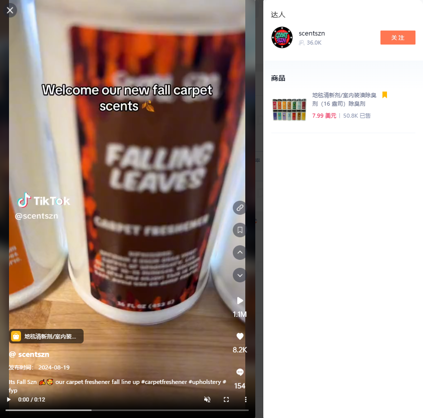 通过嘀嗒狗数据显示,视频同款在TikTok Shop的价格为7.99美金+运费6.03美金,该商品在4月25日上线TikTok Shop,目前已经售出5.2万单。 所属店铺Scent Szn Co的销售额达到470万美金。店铺售卖的产品总销量超过100万单。