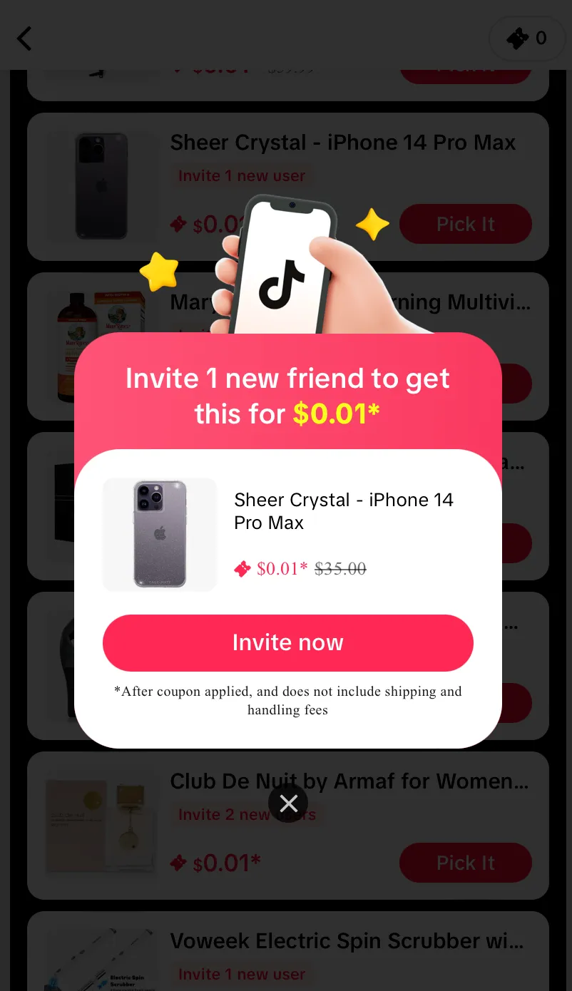 8月16日,TikTok 在美区推出拉新奖励活动,用户邀请新用户注册后,仅需负担运费即可享1美分购买原价十几美元至上百美元的商品。商品开放种类也算丰厚齐全,比如眉笔、吹风机、吸尘器等。底层规则一样是:邀请的新用户越多,可购买的商品价值越高。
