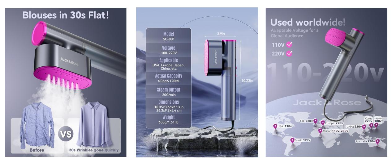 美国消费者普遍注重生活品质和细节,熨烫衣物作为日常护理不可或缺的一环,得到了广泛的重视。一款便捷、实用的产品会更容易受到人们的青睐,而Jack&Rose这款蒸汽熨斗在一定程度上满足了他们的需求。 与其他产品不同的是,Jack&Rose这款蒸汽熨斗率先采用了100V-240V宽电压技术,可以即插即用,自动适应全球电压,解决了跨国旅行中因电压差异而无法使用的困扰,非常适合国内和国际旅行商务的需求。 在设计上,这款蒸汽熨斗小巧易握,尺寸大小与750毫升矿泉水瓶差不多,易于放入背包或旅行箱,对于经常出差旅行的消费者来讲是一款不错的选择。最方便的是它拥有1000瓦的功率,仅需15秒的短暂预热,即可喷发出高达248华氏度的强力高温蒸汽,再结合10平方英寸的干熨加热板,无论是洗涤、烘干、滚筒烘干、折叠还是挤压造成的顽固皱褶,都能轻松应对,恢复衣物平整。 此外,产品内置了安全自动关闭功能,确保在操作使用时的安全性。面对大批量的衣物时也无需担心,大容量的水箱设计能够一次性满足3-5批衣物的熨烫任务,而单次最长运行时间可达10分钟,充分满足了消费者即时熨烫需求。
