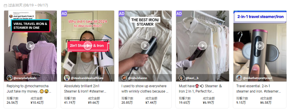 据Kalodata平台数据展示,在蒸汽熨斗带货短视频成交金额排行榜上,值得关注的是中尾部达人@crazydailydeals,粉丝基数较小的品牌可以学习和参考。视频中,他展示了一件皱巴巴的衣服如何在该款蒸汽熨斗的用下迅速恢复平整,非常直观地让用户看到产品的实用性,仅仅50秒的时间就让一件褶皱的衣服恢复平整,更体现了该产品的便捷与高效。尽管粉丝数量仅有7080,但他凭借着精准的市场定位和与粉丝间建立的深厚信任,位居排行榜第一,成交金额高达41.53万元。