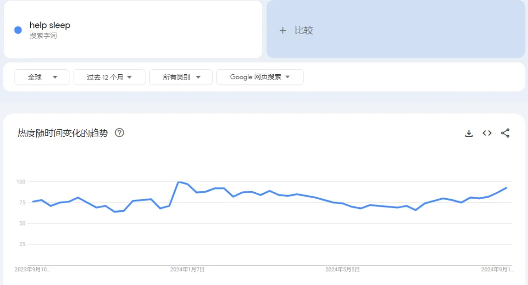 根据谷歌趋势数据显示,过去一年,全球范围内,用户在Google网页搜索“help sleep”(助眠)的热度持续处于75—100之间。