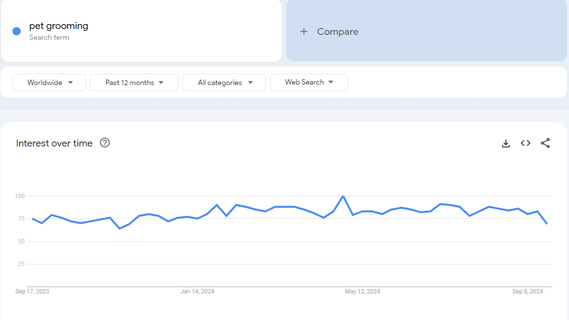 从Amazon平台上推出的宠物产品趋势可以发现,大多数产品倾向于采用天然植物作为核心配料,确保不含有刺激性成分、人工染料或香料,这充分表明了产品配料对于宠物健康是极为重要的。因此,卖家在选用产品时,应着重于创新并突出其独特卖点,例如,某些国家可能更偏爱具有特定功效(如去屑、防敏)的宠物洗发水,而另一些国家则可能更注重产品的天然成分和环保性能。通过精准定位这些市场需求点,不仅能吸引消费者还能再众多产品中脱颖而出,或许可以赢得可观的市场份额。 在Google Trends 搜索”pet grooming”(宠物清洁),可以发现过去12个月内,全球范围内对该词条的搜索热度保持在64-100的高位区间,这一趋势表明宠物清洁正日益受到更多的关注度。