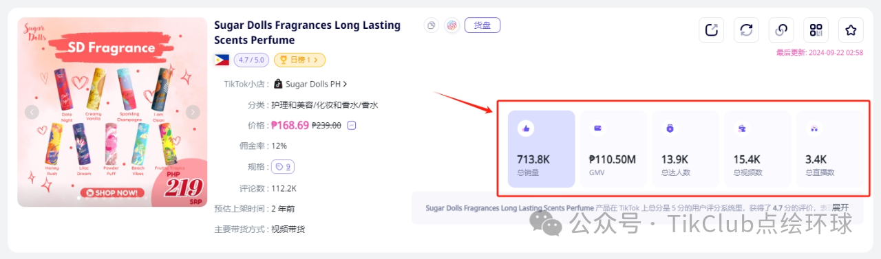 其中一个本土品牌Sugar Dolls PH也是抓住了这个机遇,在TikTok上主打一款持久香味糖果香水,收获了71万销量与1392万人民币的GMV,在2024-9-22更是登上了菲律宾热销日榜TOP1。