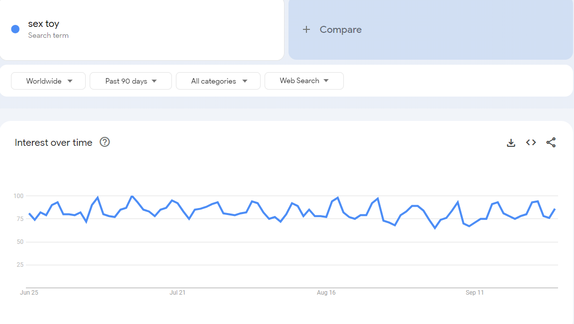 情趣用品成为“出海”刚需赛道随着社会进步和人们观念的开放,人们对性的认知和态度逐渐开放,在性生活方面已不再仅仅满足于单一的性需求,越来越多的人开始正视和讨论性健康等话题,情趣用品作为性健康产业的一部分,也逐渐被大众所接受。 在Google Trends 搜索”sex toy”(成人用品),可以发现过去90天内,全球范围内对该词条的搜索热度保持在65-100的高位区间,这一趋势表明成人用品具备着较大的增长潜力和用户需求。