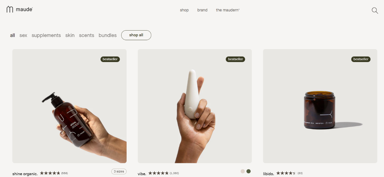 由于产品的特殊性,在亚马逊等电商平台对情趣用品的推广限制,独立站逐渐成为该系列产品的主流售卖模式。作为一家成立于2018年的品牌,仅三年时间就实现2500万美元销售额,其背后的原因不仅在于其精准捕捉了市场需求,更在于品牌所秉持的独特理念。 Maude官网的畅销产品主要是震动用品,包括vibe(震动棒)、drop(震动产品)、cone(私处用品)、shineorganic(润滑油),这些产品的外观非常简约、大方,以白色、浅灰、棕色为主,摒弃了传统成人用品以粉紫色为主追求视觉的刺激感。其价格介于25-49美元之间,同时,从Maude的官方网站也可以观察到,网站的整体配色和产品设计风格相一致,偏向简洁与低调,为用户提供了一个舒适的浏览体验。