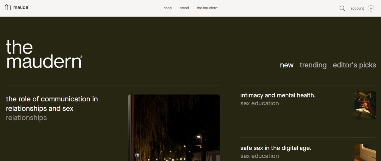 Maude的宗旨是希望打造能够真正融入需求者世界的性健康产品。所以他们的设计团队会优先考虑性别、年龄和身体包容性,希望打造的产品可以去色情化,甚至弱化性别元素,这一设计风格与很多直接露骨的品牌形成了鲜明对比,赢得了市场的广泛认可。 此外,Maude还在官方网站上提供由专业心理咨询师和社会学家合作撰写的知识类文章,目的是为用户提供全面而深入的健康指导。这些文章不仅涵盖了身体健康、性健康方面的知识,还延伸到恋爱关系、婚姻观念等更广泛的领域,帮助用户在使用产品的同时,树立正确的身体认知,培养健康的恋爱观和婚姻观,实现身心的全面和谐。