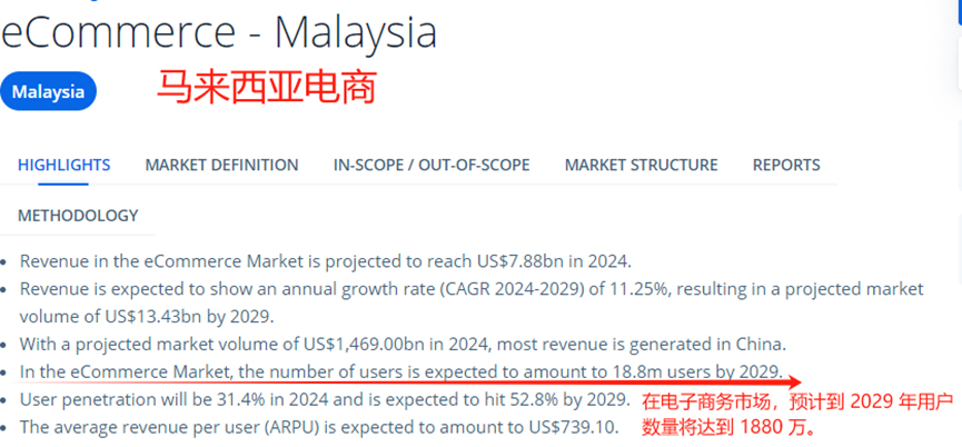 坦白说,TikTok Shop能在马来西亚取得如此亮眼的成绩,离不开当地电商市场的大力助推。作为东南亚第三大经济体,近年来马来西亚的电商行业可以说是搭上了发展快车道,前景一片大好。 根据Statista的数据,2024年,马来西亚电商渗透率约为31.4%,预计到2029年将提至52.8%,届时该市场的电商用户数量将达到1880万。而Bain analysis的数据则指出,到2025年,马来西亚电商市场规模就能突破190亿美元大关。