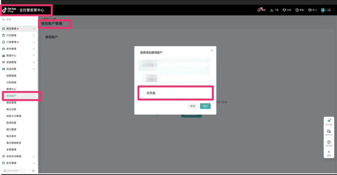 3、操作指南:TikTok全托管店铺后台一资金账户 一提现账户管理 一选择添加提现账户—选择派安盈。