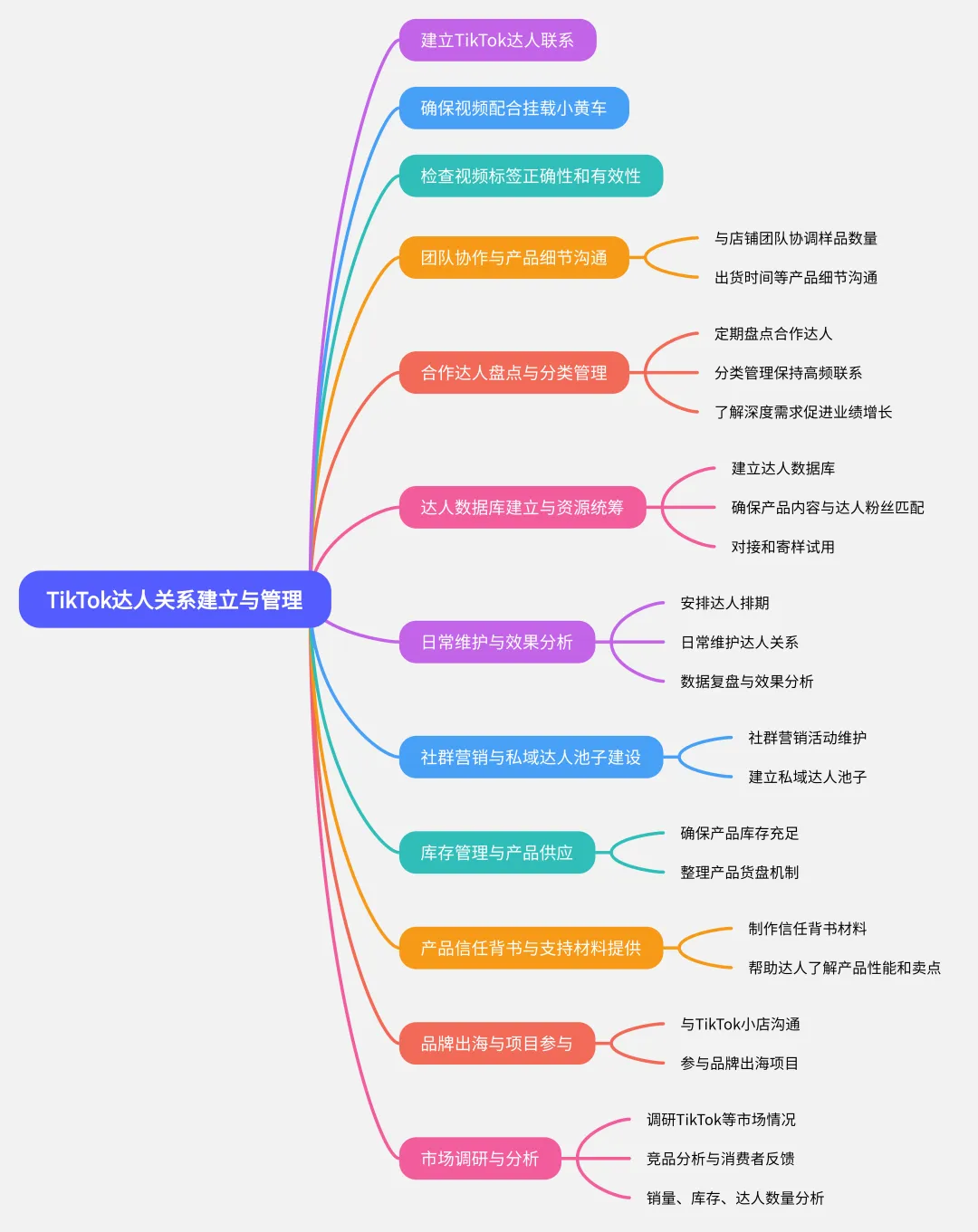 - 定期进行TikTok合作达人的盘点,分类管理,保持频繁且高质量的联系,了解他们的深度需求,以加强深度合作,促进总体业绩的增长。