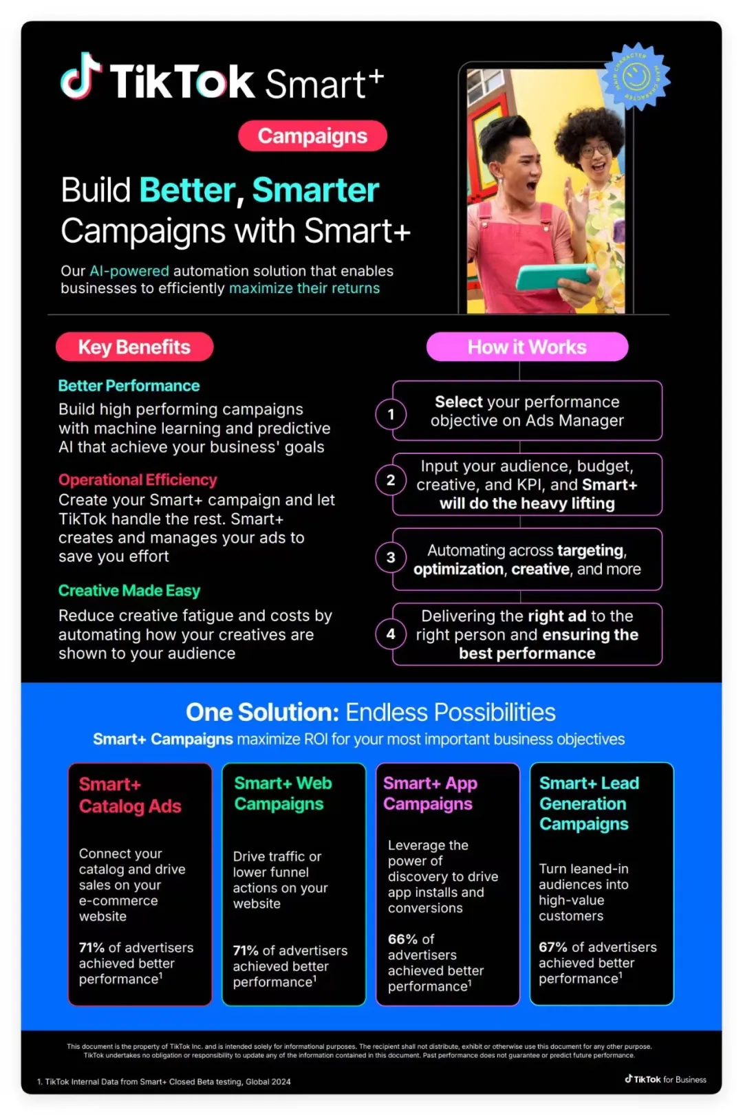 一、TikTok全新推出“Smart+”,是什么?1、TikTok 正式推出Smart+,一款对标谷歌Performance Max和 Meta Advantage+的AI驱动广告工具。2、这款工具号称可以自动化从创意开发到定位和优化的所有流程,让广告投放变得“毫不费力”。3、TikTok投手只需设定目标,TikTok的AI就会负责制作和投放广告,以推动转化、潜在客户或应用下载。4、Smart+还提供模块化功能,投手可以选择性地使用其功能,例如只利用AI创建和优化广告,而自行管理广告活动。5、“ Smart+ 可自动执行涵盖定位、竞价和创意的绩效广告流程,以便向合适的人投放合适的广告,从而实现最佳效果。