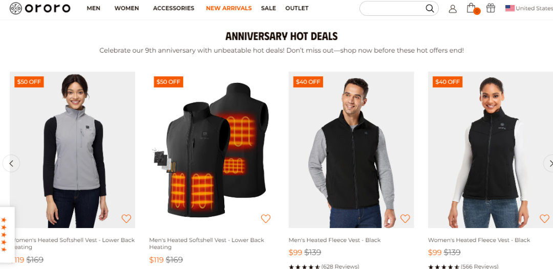 一提到服饰赛道,不少人都感慨“简直是红到发紫了”!毕竟近10年来,全球服饰市场规模都是万亿美元的级别。不过市场从不缺乏寻找机会的人,美国电加热服饰品牌ORORO就是代表之一。与普通主打时尚设计的服饰不同,电加热服饰是一种配备温度调节组件的新兴服饰类型,通常由可充电电池或便携式电源供电,对于户外运动群体来说非常实用。作为“行业潜力股”,ORORO主做以锂电池驱动的加热功能性服装,如加热马甲、夹克、卫衣等,产品设计完善,完美契合市场需求。其品牌名则来源于漫威漫画中具有操控天气能力的超级英雄,有着“不惧天气、挑战严寒”的寓意。