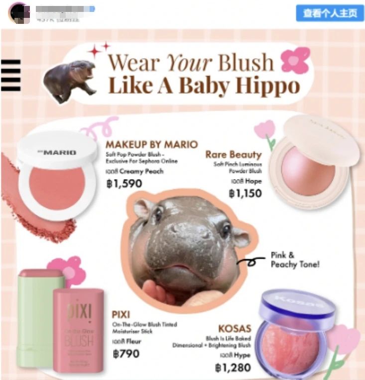 我们注意到,借着此次的东风,泰国某化妆品品牌已经打出了“像一个婴儿河马那样涂腮红”的广告词。