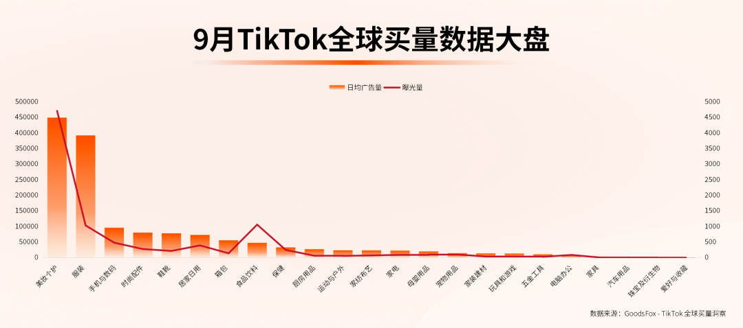 GoodsFox的全球市场分析报告揭示了惊人的数据:本年9月,TikTok上的美妆及个人护理品类广告曝光量激增至惊人的47亿次,日均广告投放量突破44.9万大关,稳居各类目之首。考虑到TikTok全球月活跃用户数已攀升至15.6亿之多,这意味着每位用户平均每天都能邂逅约30次美妆个护相关的广告推送,展现了该领域极高的市场渗透力与关注度。