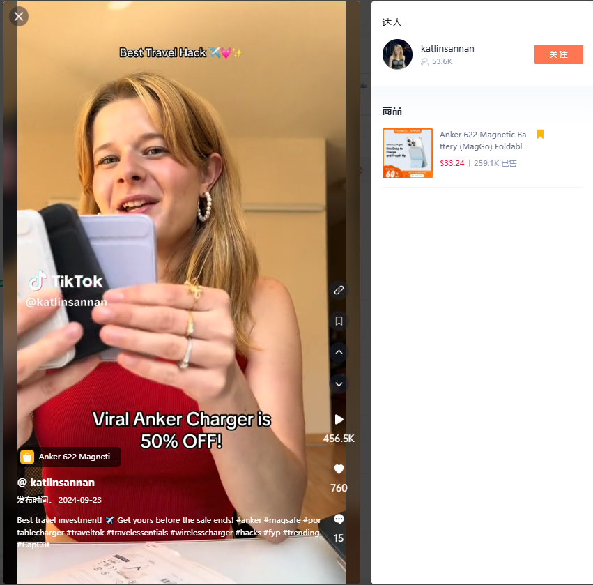 [mcv_dplayer source="https://img.tkfff.com/2024/10/10月23日.mov" width="100%" height="500"] @katlinsannan的视频发布于9月23日,嘀嗒狗后台观察到该视频目前的播放量已有45.6万。在视频中,博主向我们展示了这款便携充电宝的各种功能,再加上产品的折扣,非常的实用且诱人 而下方评论区的用户也非常喜欢这款方便且充电效率强大的充电宝,有人说:我爱安克,它的产品一定OK!