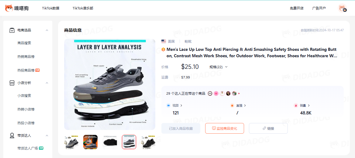 通过嘀嗒狗数据显示,视频同款在TikTok Shop的价格为25.1美金+7.99美金运费,该商品在7月18日上线TikTok Shop,目前已经售出4.8万件,且多日销量稳定在1千单左右。 所属品牌NBQR的主要产品以各种工装靴和防爆鞋为主,小店于7.9日进入TikTok,目前总销售额超过170万美金。