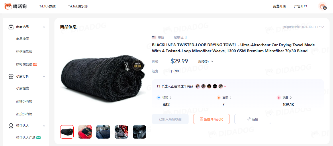 通过嘀嗒狗数据显示,视频同款在TikTok Shop的价格为29.99美金+5.99美金运费,该商品在23年8月19日上线TikTok Shop,目前已售出10.9万单。在10.7日,该产品卖出1200单,10.12日,卖出1100单,非常有潜力。 所属店铺Blackline Car Care在TikTok Shop的销售额达到770万美金,店铺整体以汽车用品为主,店铺售卖的产品总销量超过22万单。